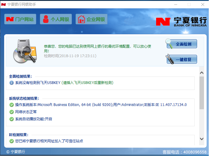 第二步:運(yùn)行寧夏銀行網(wǎng)銀助手,啟動(dòng)全面檢測(cè)