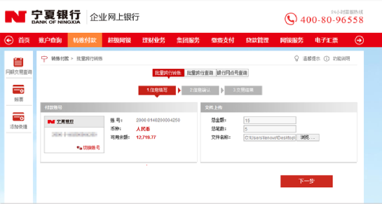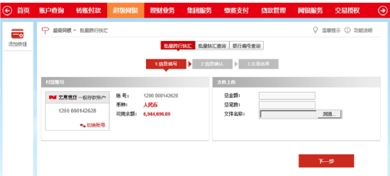 2、在錄入頁輸入轉賬的總金額以及總筆數(shù),點擊按鈕“瀏覽”,選擇要上傳的文件,點擊下一步;