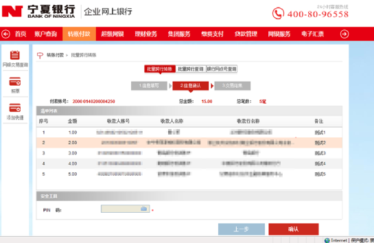 4、進入確認頁面,查看收款信息是否正確,無誤后請輸入證書pin碼,點擊“確認”