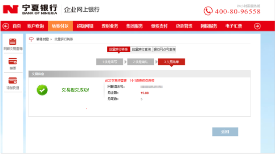 5、交易提交后,請根據(jù)結果頁面提示確認是否需要審核;
