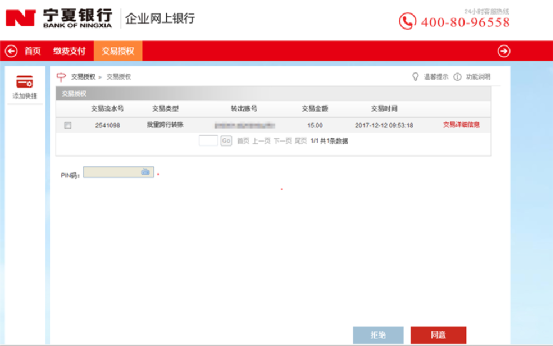 6、用企業(yè)審核員用戶登錄網銀系統(tǒng),進入菜單“交易授權->交易授權”,點擊交易類型為“批量轉賬”記錄的最后列“交易詳細信息”,查看交易詳細信息,然后點擊“返回”;